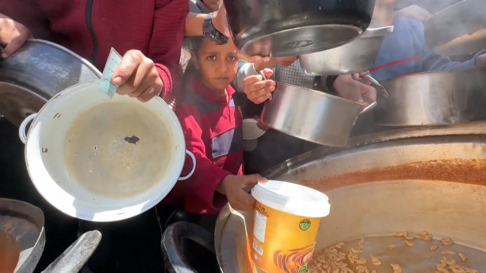 This comes as some 170 community kitchens across Gaza have shut down after running out of food due to Israel’s total blockade. Displaced Palestinian mother Huda Abu Diyya says she does not know how she will feed her children after a Khan Younis community kitchen served its last meals Thursday.